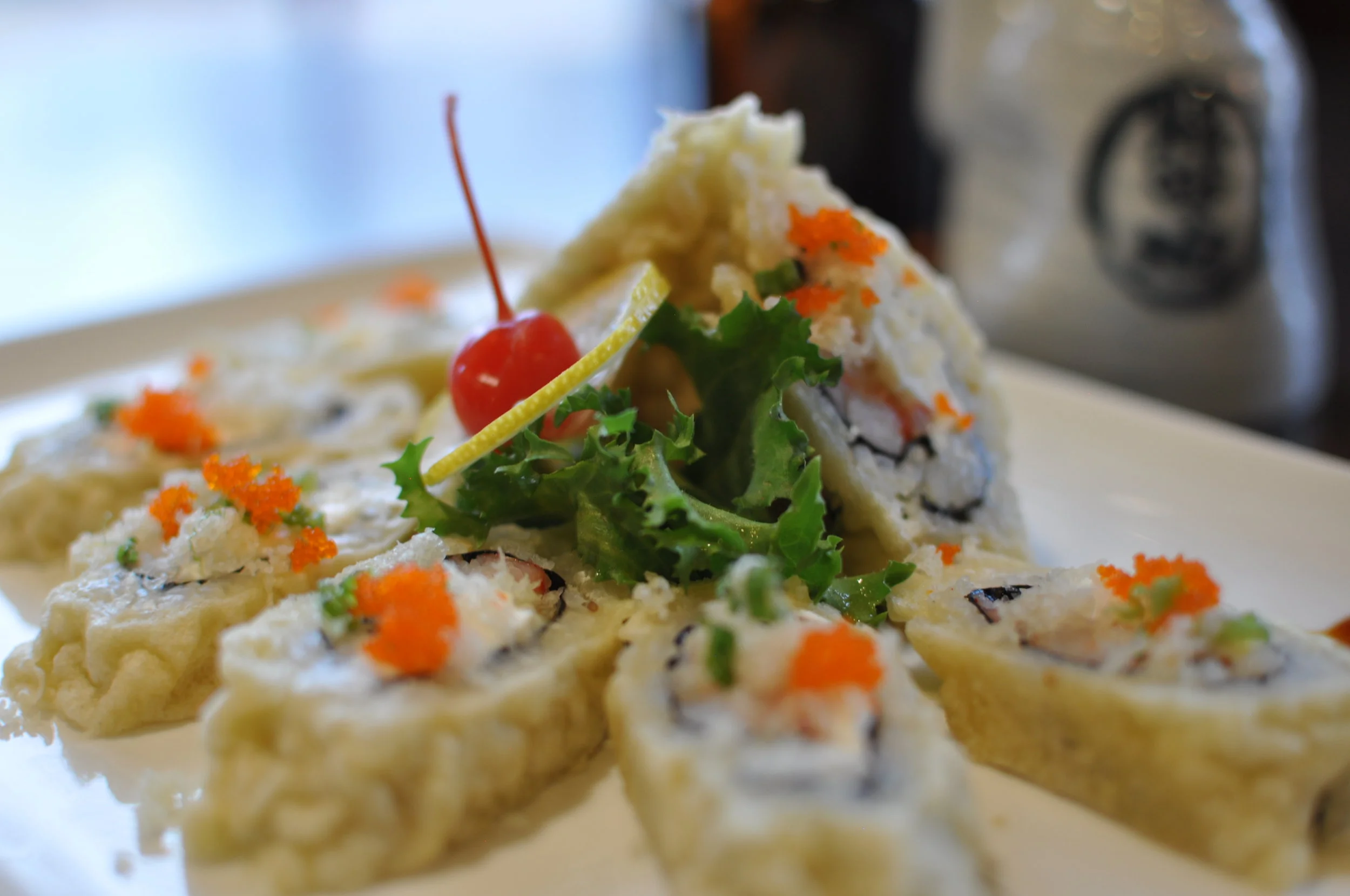 Baby lobster tempura wrapped in soy paper, and topped with shrimp & tobiko